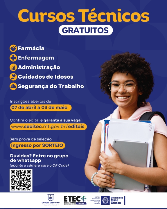 A Escola Técnica Estadual de Cáceres abriu inscrições para cursos técnicos gratuitos com início no segundo semestre de 2026. Ao todo, são ofertadas vagas para cinco formações: Administração, Enfermagem, Farmácia, Segurança do Trabalho e Cuidados com Idosos, todas no período noturno.