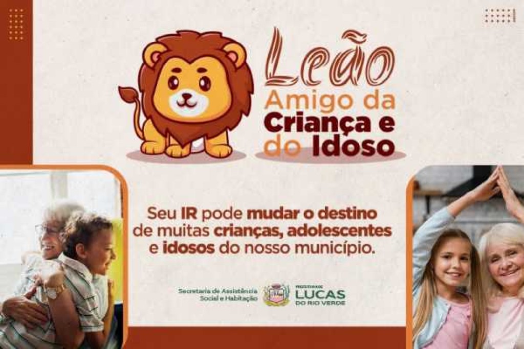 A Prefeitura de Lucas do Rio Verde informa que o período de declaração do Imposto de Renda em 2026 será de 16 de março a 29 de maio. Durante esse prazo, contribuintes podem destinar parte do imposto para projetos sociais do município, por meio da campanha Leão Amigo da Criança e do Idoso.