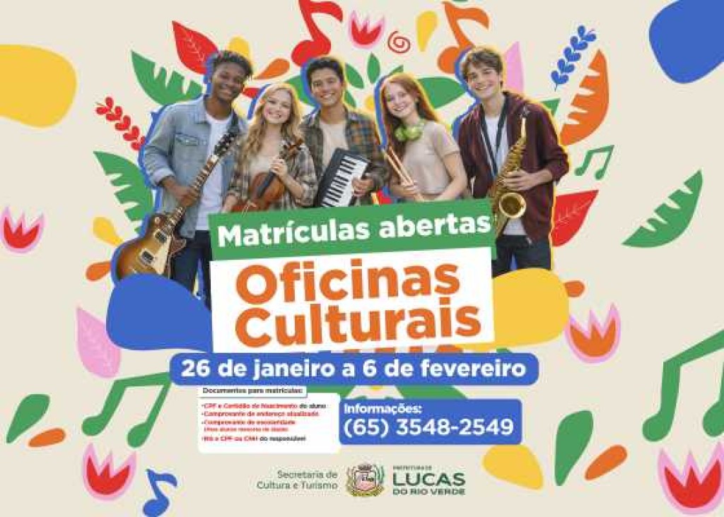 A Prefeitura de Lucas do Rio Verde, por meio da Secretaria de Cultura e Turismo, informa que estão abertas as matrículas para as Oficinas Culturais 2026. Os interessados podem se inscrever até o dia 6 de fevereiro, exclusivamente pela internet, por meio do link: