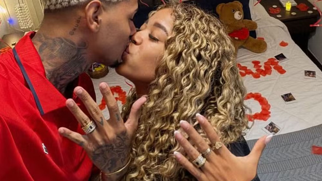 Para marcar o momento, ele entregou um anel de compromisso chamativo, com pedras e o nome do casal gravado nas bordas. Confira cliques abaixo: