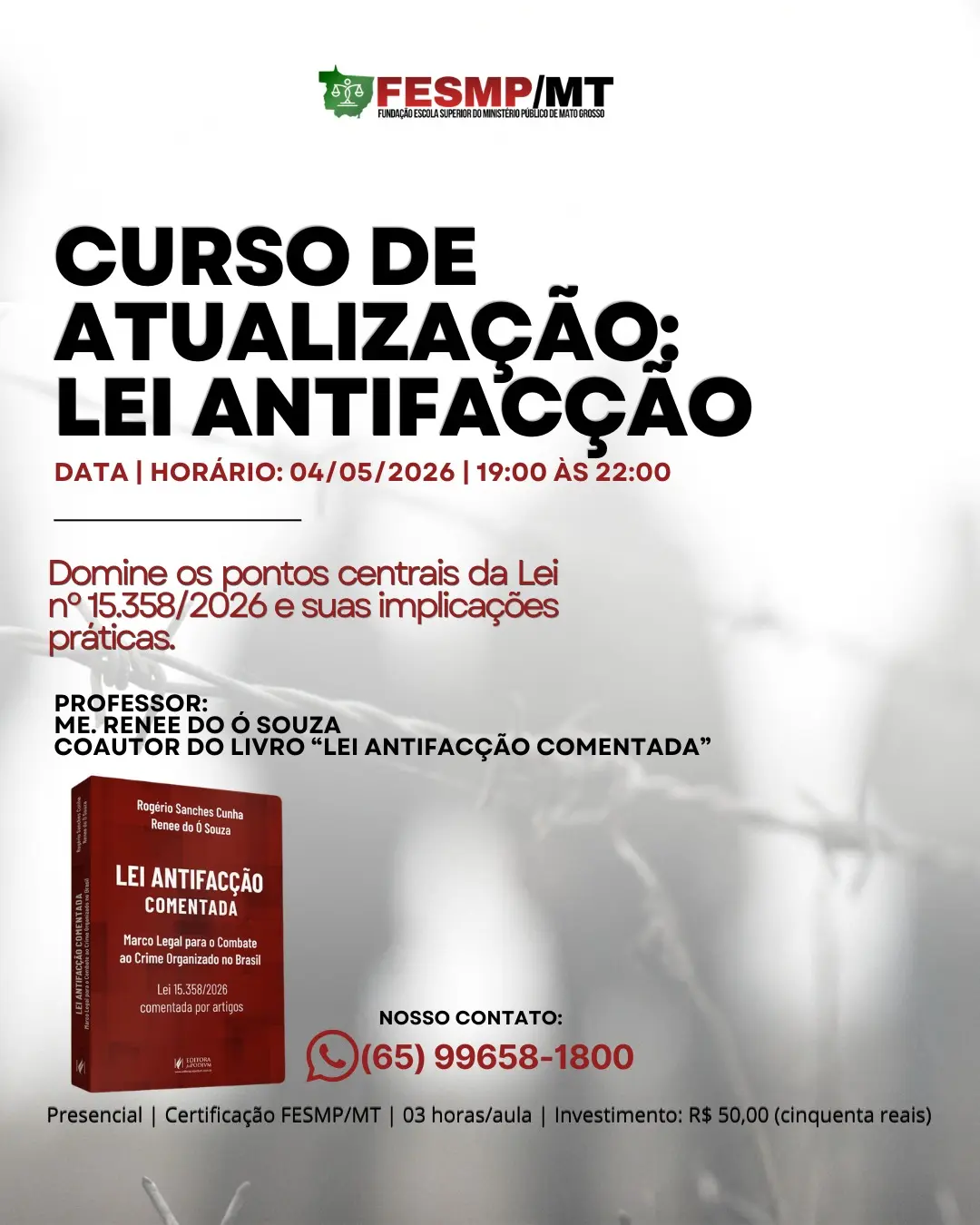 Já estão abertas as inscrições para o curso ‘Atualização: Lei Antifacção’ e a Escola Superior da Magistratura de Mato Grosso oferece 50 vagas para desembargadores(as) e juízes(a) que queiram participar. O aperfeiçoamento será realizado em 4 de maio, das 19h às 22h, na Fundação Escola do Ministério Público de Mato Grosso (FEMSP), parceira da Esmagis no aprimoramento de membros e servidores do Judiciário mato-grossense.A capacitação tem como objetivo apresentar os principais dispositivos da nova legislação (Lei 15.358/2026), seus impactos imediatos no processo penal e os desafios decorrentes de sua aplicação prática, especialmente no contexto do fortalecimento e da crescente complexidade das organizações criminosas.