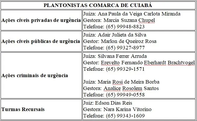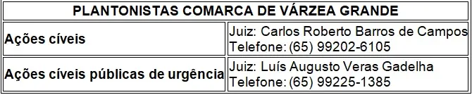 Para atendimento das medidas urgentes de Saúde Pública, de competência da 1ª Vara Especializada da Fazenda Pública de Várzea Grande, o Tribunal de Justiça de Mato Grosso disponibilizou o telefone (65) 99202-6105, para atendimento das medidas de plantão, que se inicia a partir das 19h desta sexta-feira até o início do expediente seguinte, na segunda-feira (12h).