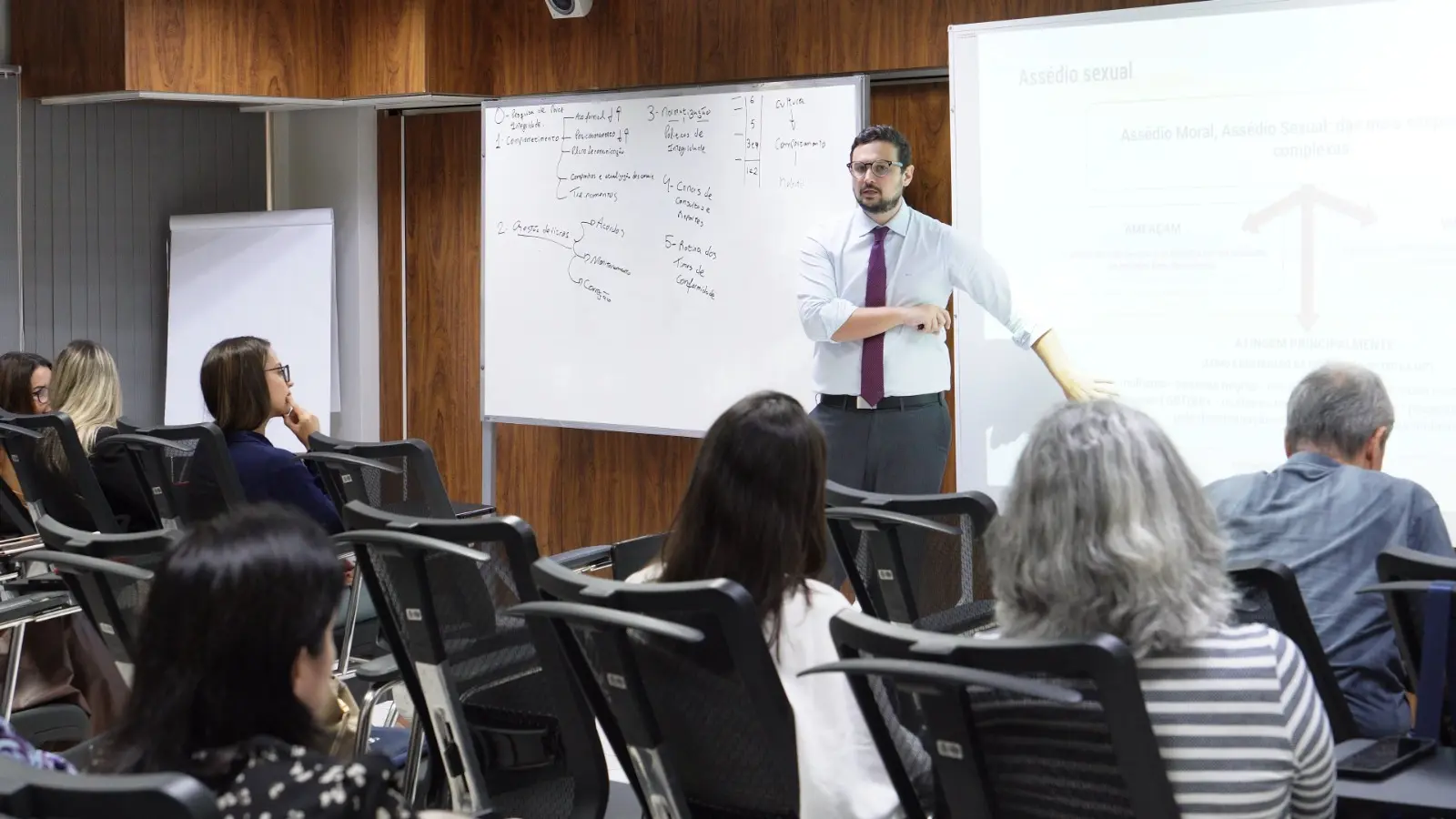 Um dos pontos abordados durante a formação foi a diferenciação entre tipos de conduta no ambiente de trabalho. O especialista explicou que opiniões pessoais, quando não ofensivas, fazem parte da convivência, mas alertou para comportamentos que podem evoluir para situações mais graves.