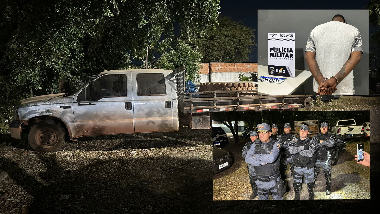 Durante a ação, os policiais encontraram no interior da residência uma placa veicular avulsa. Questionado, Jhonanthan afirmou espontaneamente que havia furtado um caminhão Ford F-350 no estacionamento do supermercado Atacadão, localizado na Avenida Júlio Campos, e que pretendia usar a placa para remover o veículo do esconderijo.