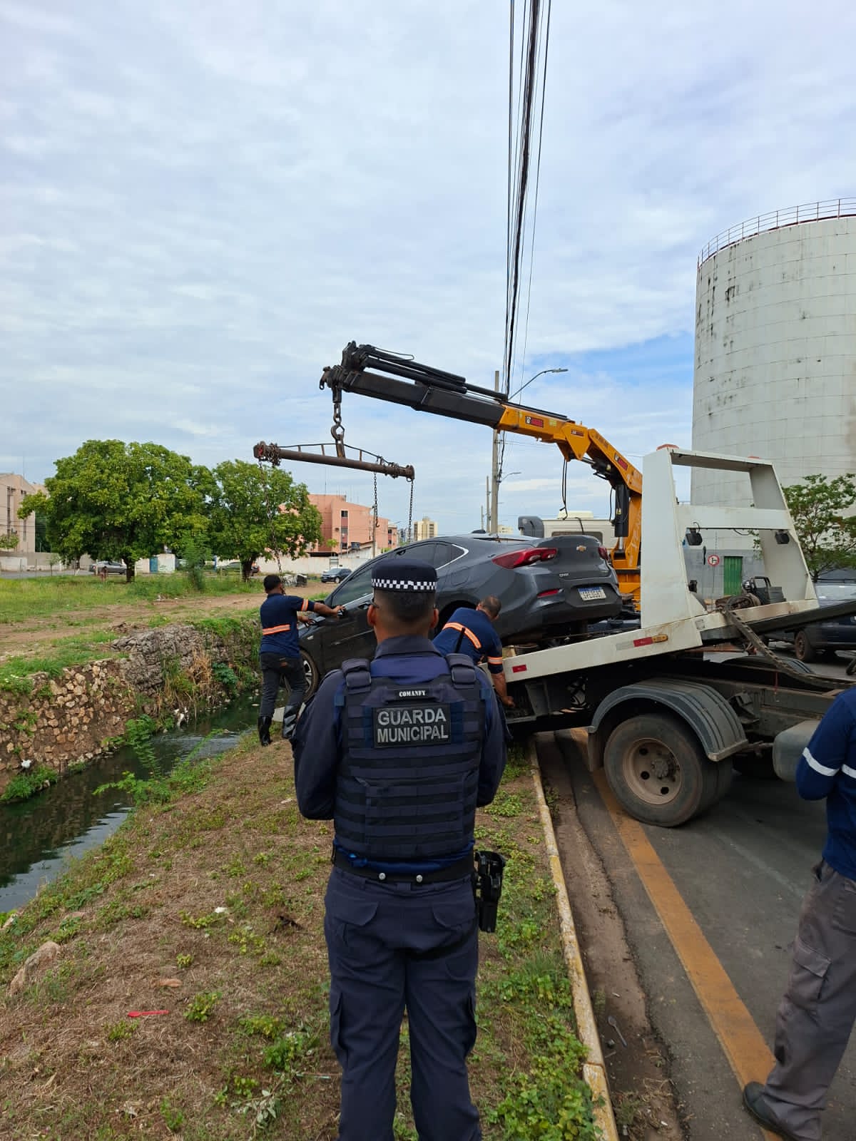 Um veículo Chevrolet Onix sedan caiu em um córrego localizado na lateral do Shopping de Várzea Grande, na Avenida Fuad Auada, na noite de domingo (26).