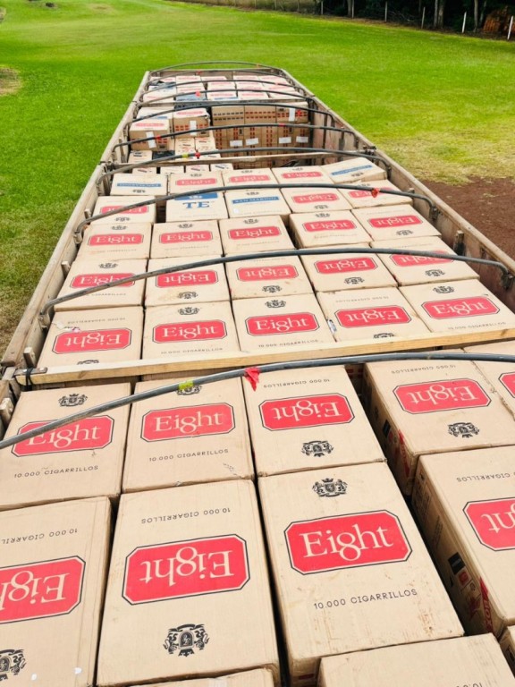 Durante a abordagem simultânea, constatou-se que os condutores, de nacionalidade paraguaia, agiam de forma coordenada. No compartimento de carga da carreta foram localizadas 603 caixas de cigarros de origem estrangeira, desacompanhadas de documentação fiscal. A outra carreta, conduzida por um dos indivíduos, era utilizada como veículo batedor, trafegando à frente e mantendo contato com o condutor do caminhão carregado, com a finalidade de alertá-lo sobre a presença da fiscalização.