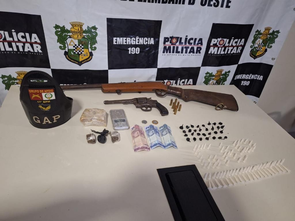 Policiais militares do 17º Batalhão prenderam um homem, por porte ilegal de arma de fogo e tráfico ilícito de drogas, nesta segunda-feira (16.2), em Lambari D’Oeste. Com o suspeito, foram apreendidas 119 porções de drogas entre cocaína, maconha e pasta base, além de um fuzil, um revólver e sete munições de calibre .38.