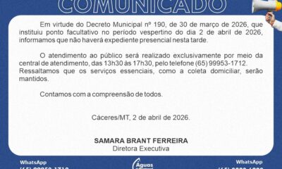A Prefeitura de Várzea Grande publicou o decreto n° 21/2026 que dispõe sobre o ponto facultativo a partir das 12h desta quinta-feira, dia 2 de abril,...