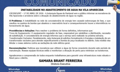CÁCERES/MT – 17 DE ABRIL DE 2026 – A Autarquia Águas do Pantanal vem a público informar os moradores da Vila Aparecida e arredores sobre a...